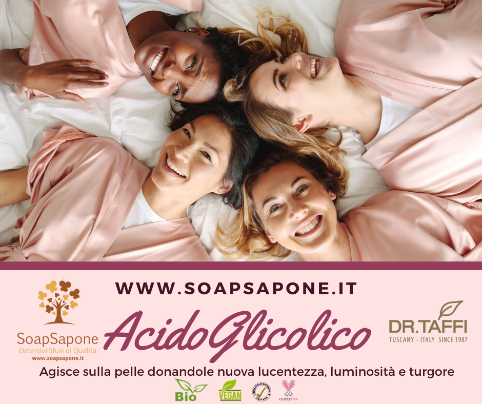 L’acido glicolico appartiene alla classe degli α-idrossiacidi, che sono noti anche come acidi della frutta; di questi fanno parte anche l’acido citrico (agrumi), l’acido tartarico (uva), l’acido malico (mele), ecc.